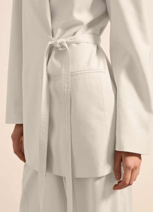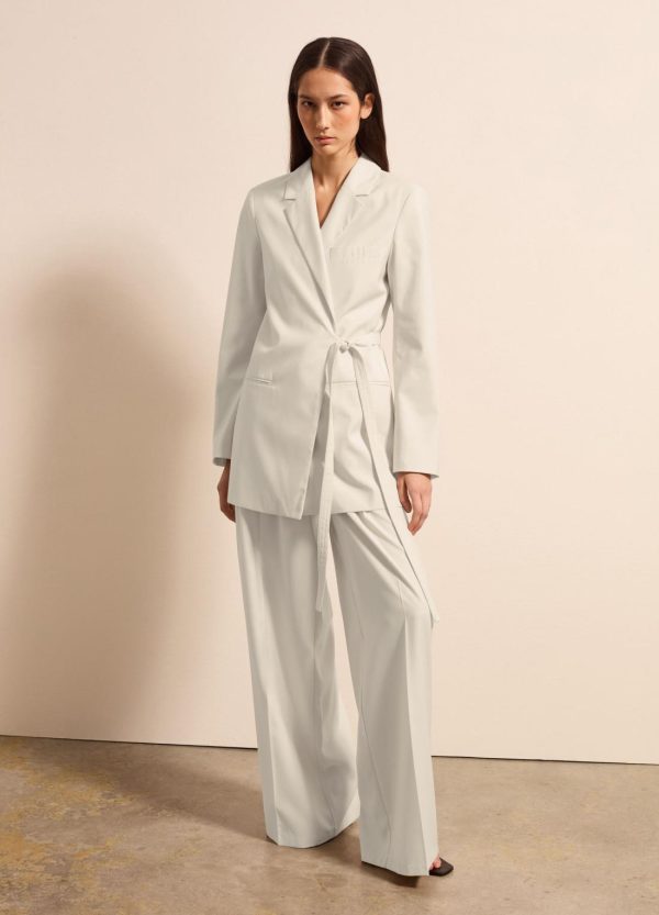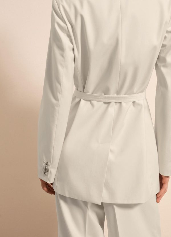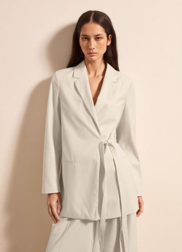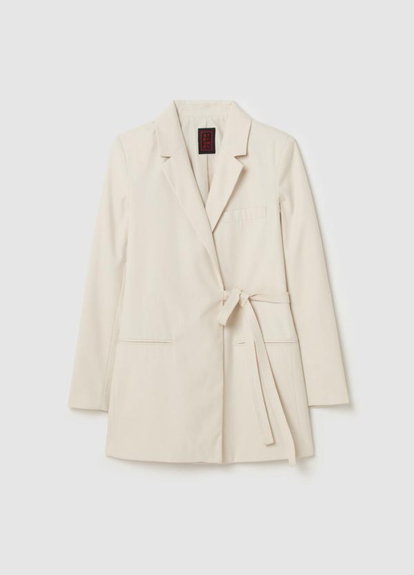 Blazer realizzato in misto viscosa. Collo con revers. Due tasche orizzontali a filo. Spacco centrale sul retro. Bottoni ai polsi. Chiusura a portafoglio con cintura morbida annodata sulla vita. Componibile con pantalone abbinato.