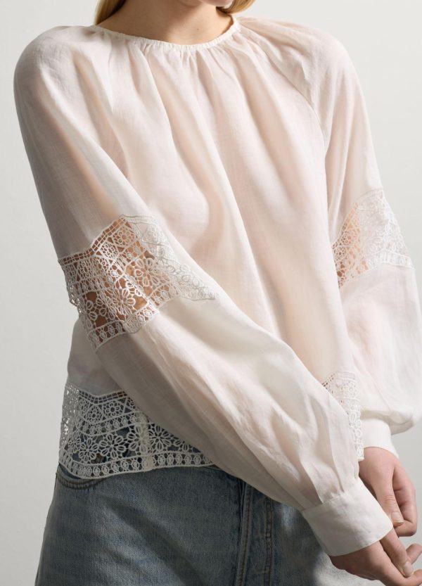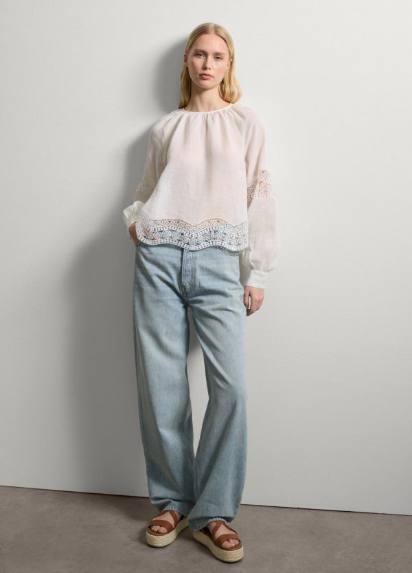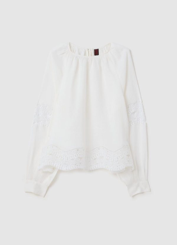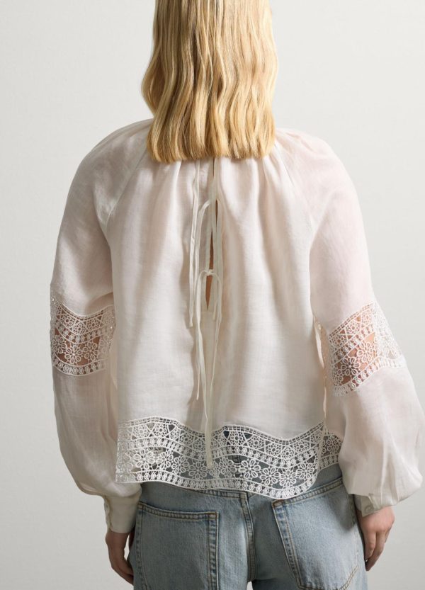 Blusa realizzata in puro ramiè con dettagli in pizzo floreale traforato. Scollo rotondo con pinces. Maniche lunghe raglan e bottoni ai polsi. Chiusura con laccetti sul retro.
