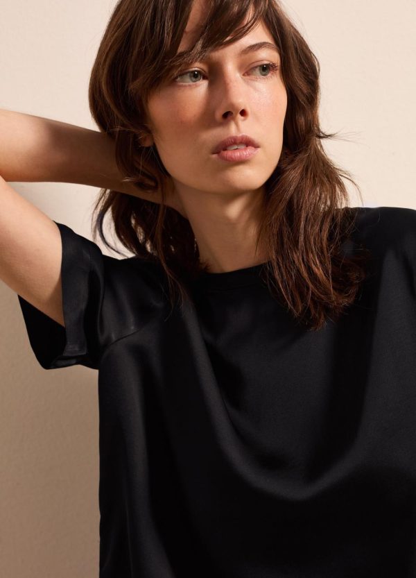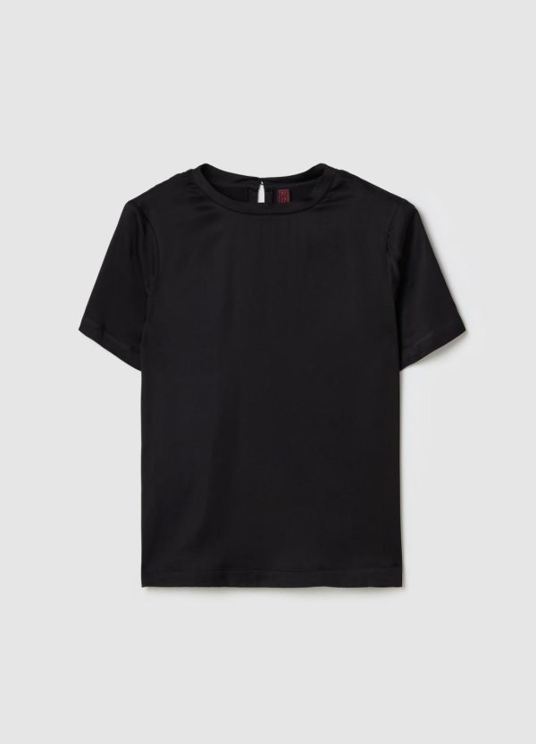 Blusa realizzata in pura viscosa satin. Scollo rotondo. Maniche corte. Chiusura a goccia con bottone sul retro. Vestibilità regolare.