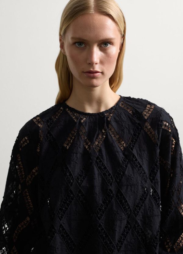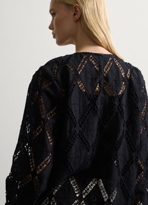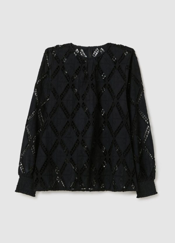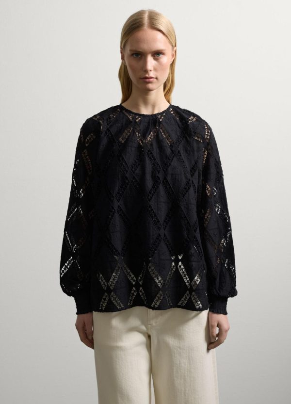 Blusa realizzata in puro cotone con motivo intarsio a rombi. Scollo rotondo. Maniche lunghe a sbuffo e polsini in punto smock. Chiusura a goccia con bottone sul retro.
