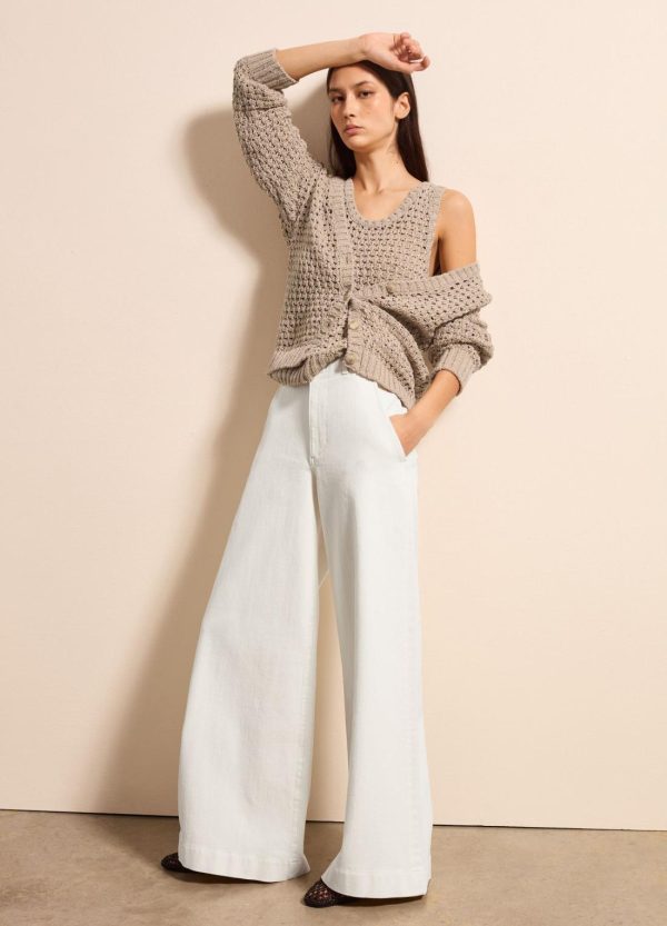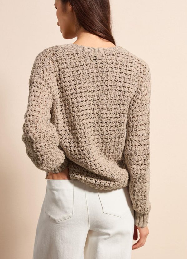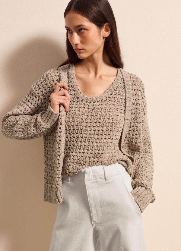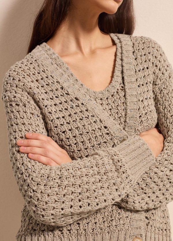 Cardigan realizzato in maglia di misto cotone e viscosa con lavorazione traforata a intreccio. Scollo a V. Giromanica sceso. Chiusura con bottoni. Profili rifiniti a coste. Componibile con top abbinato. Questo capo è stato realizzato con l’utilizzo di cotone riciclato.