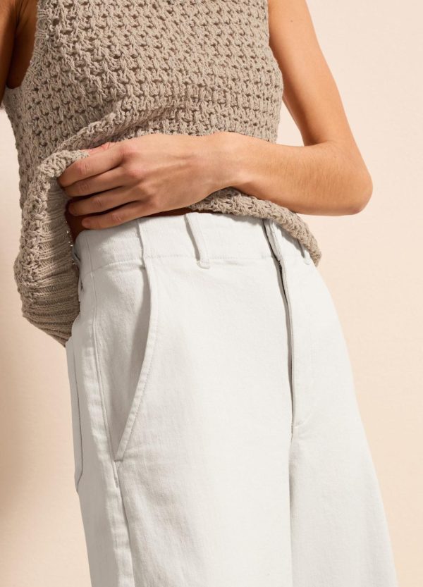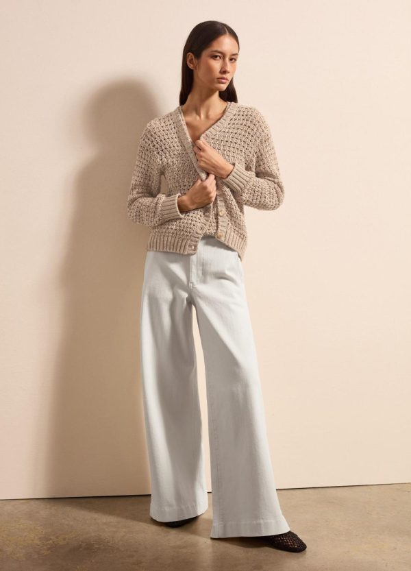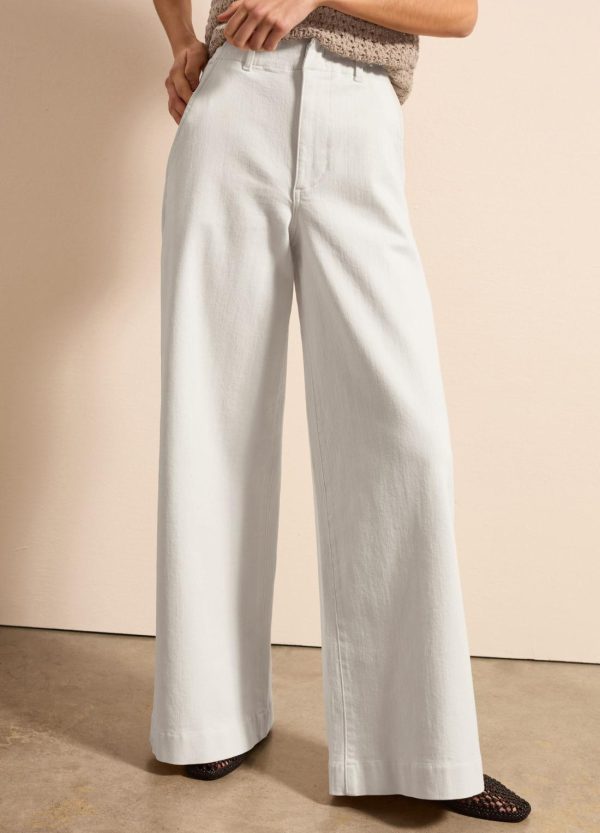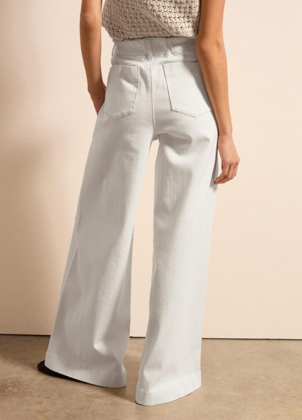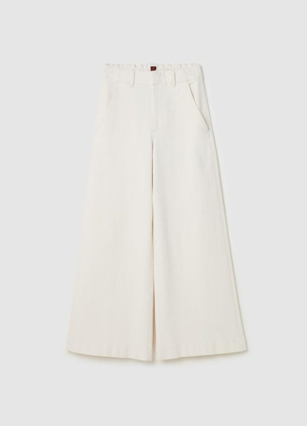 Jeans a gamba larga realizzato in cotone elasticizzato. Vita alta. Due tasche oblique e due tasche applicate sul retro. Chiusura nascosta con gancio interno e zip.