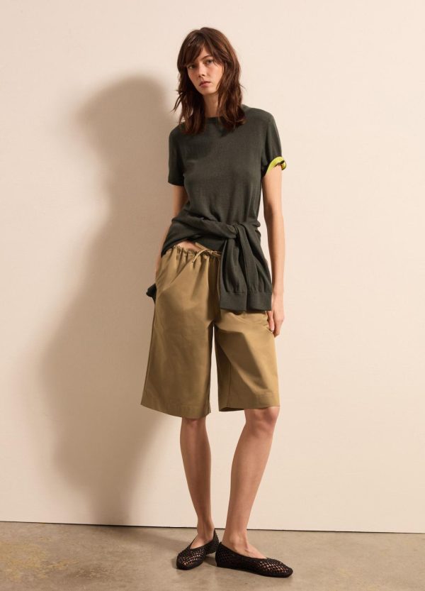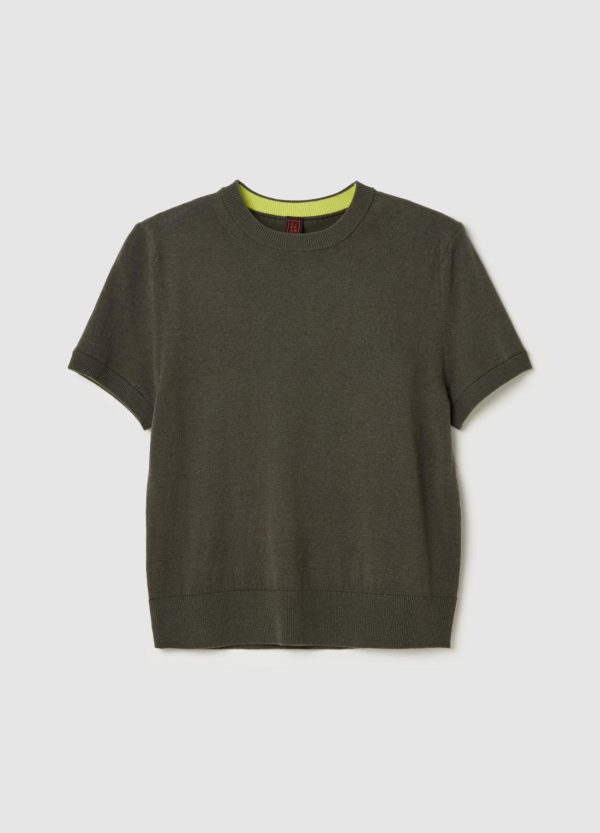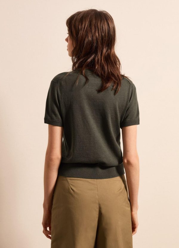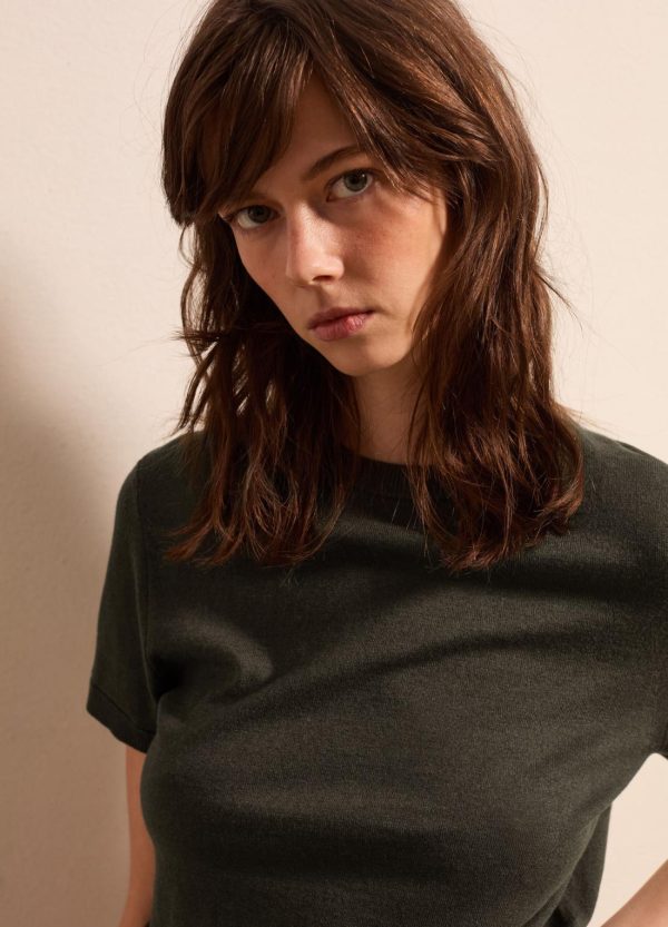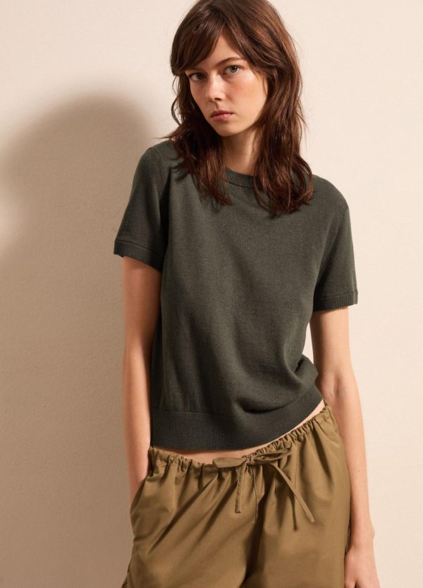 Maglia realizzata in filato di misto lana, cotone e cashmere tinta unita. Scollo rotondo. Maniche corte. Profili rifiniti a costine. Componibile con cardigan abbinato.