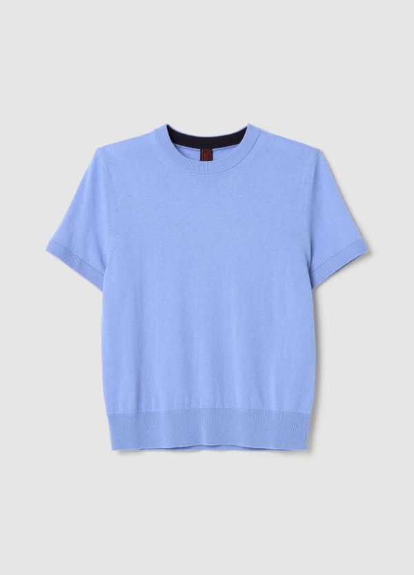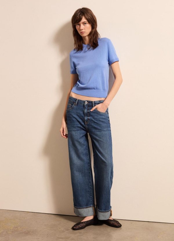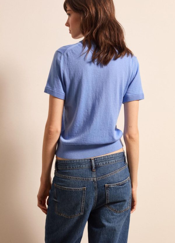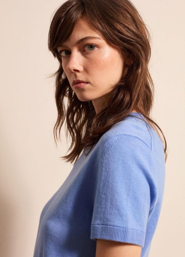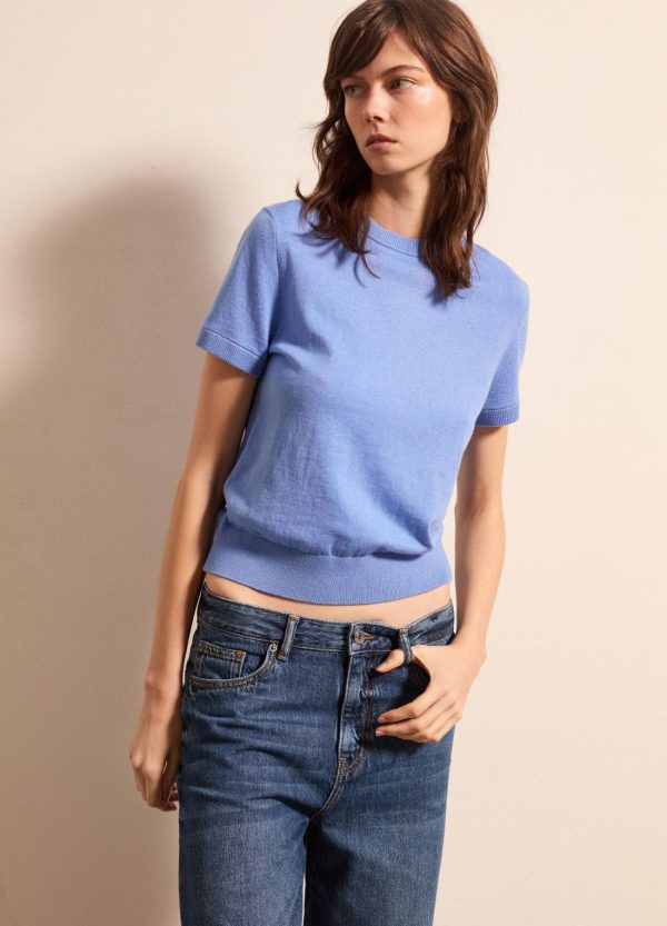 Maglia realizzata in filato di misto lana, cotone e cashmere tinta unita. Scollo rotondo. Maniche corte. Profili rifiniti a costine. Componibile con cardigan abbinato.