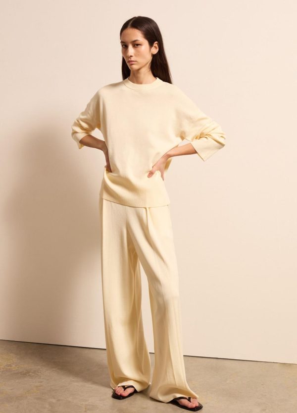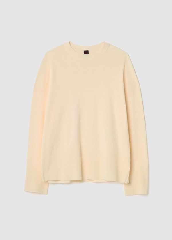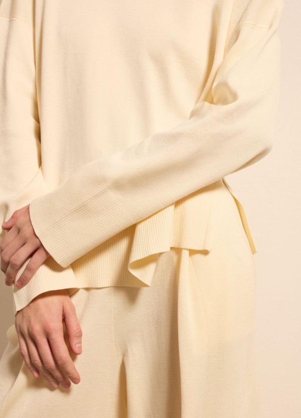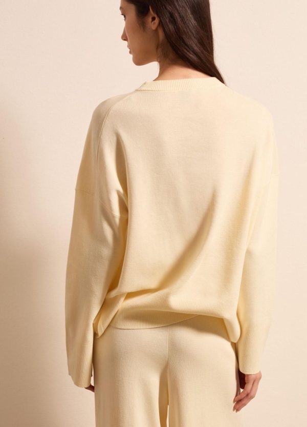 Maglia realizzata in filato di puro cotone. Scollo rotondo. Maniche lunghe. Fit over con giromanica sceso. Spacchetti laterali al fondo. Profili rifiniti a costine. Componibile con pantalone abbinato.