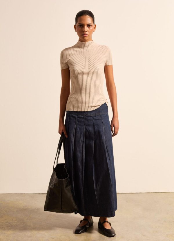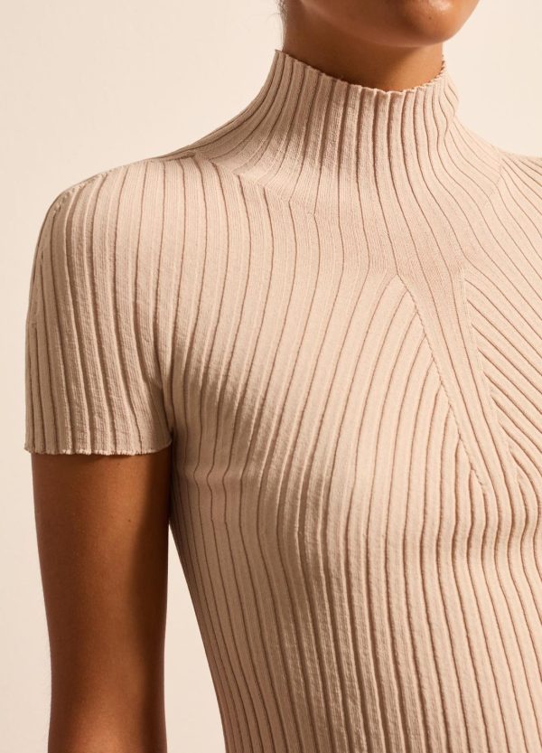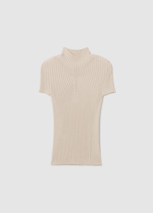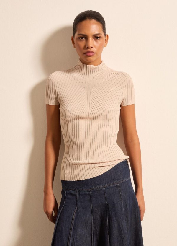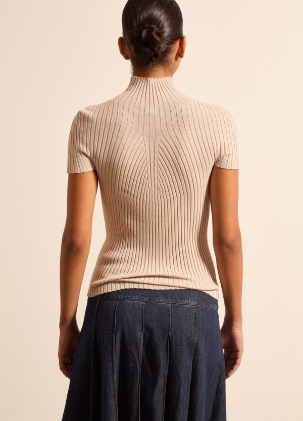 Maglia realizzata in crêpe di misto viscosa sostenibile certificata FSC® a coste piatte. Vestibilità aderente. Mock neck. Maniche corte.