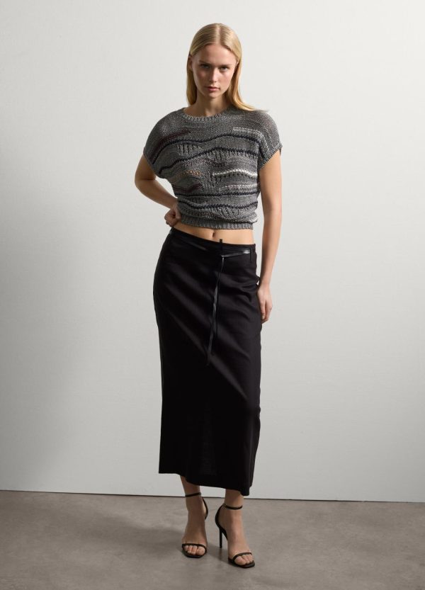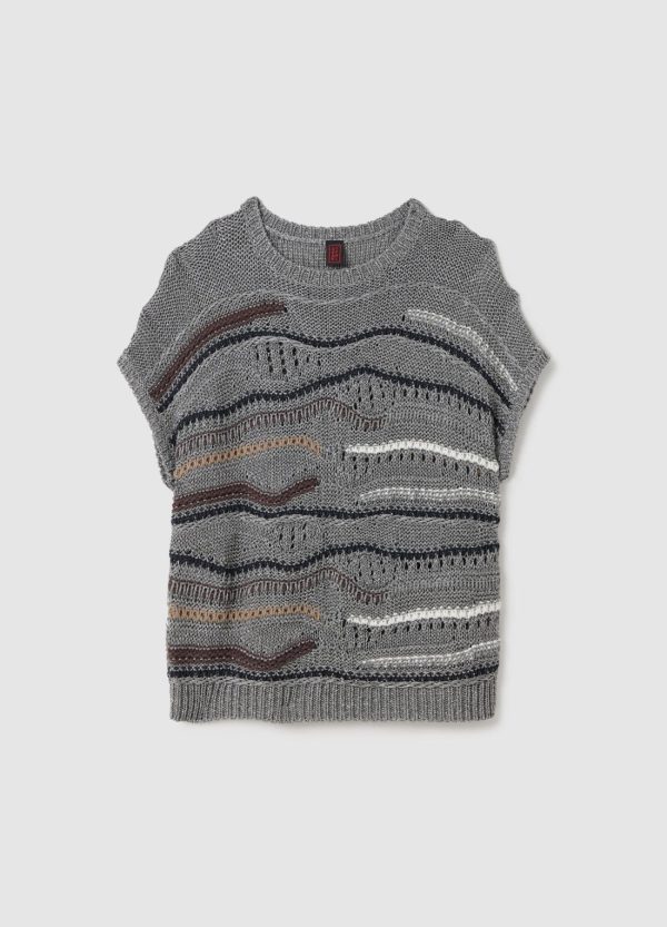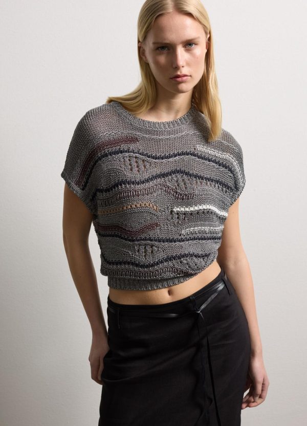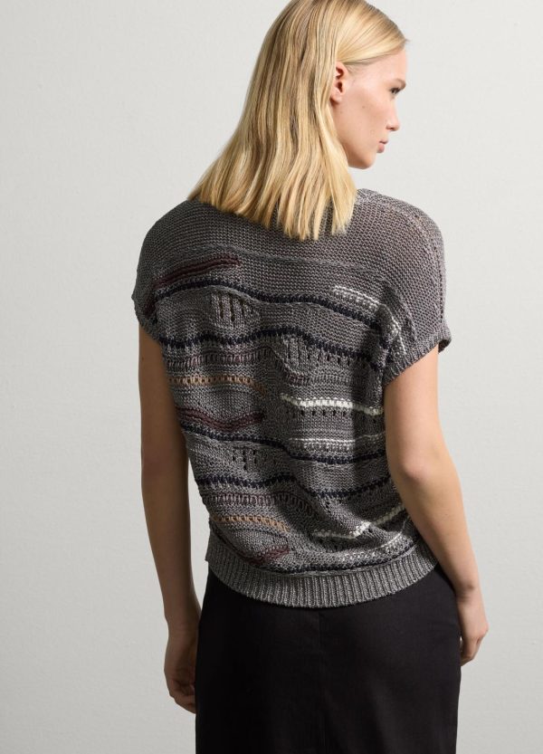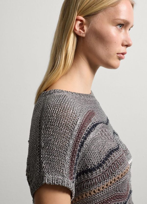 Maglia realizzata in filato di misto viscosa e cotone con dettagli in lurex. Motivo con dettagli a contrasto fronte e retro. Scollo rotondo. Maniche corte. Profili rifiniti a costine. Vestibilità regolare.