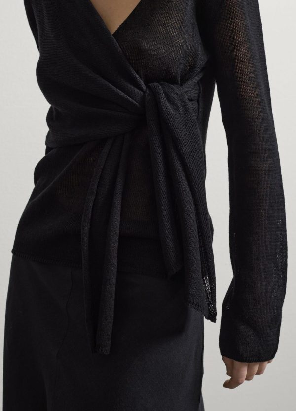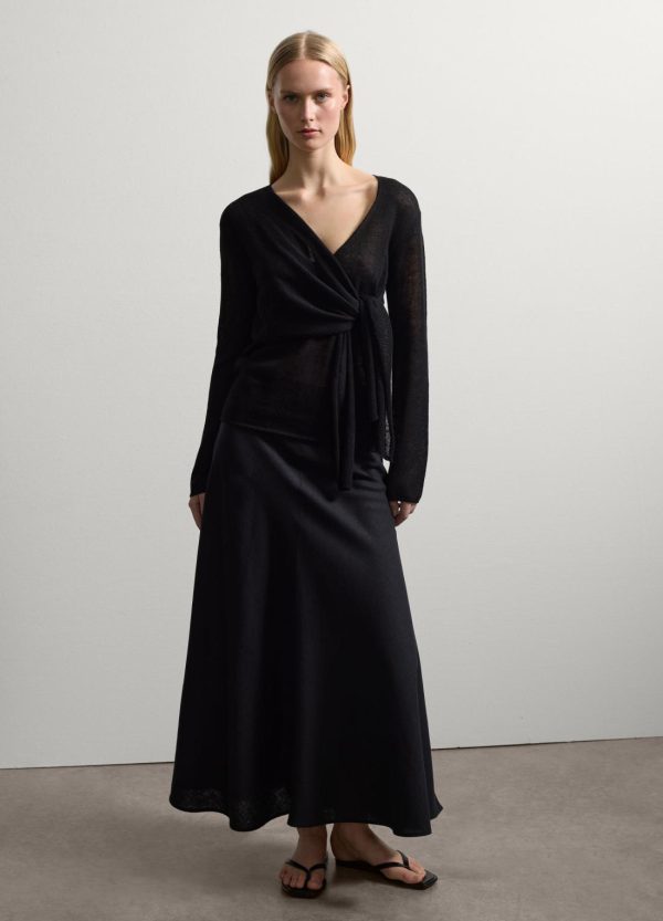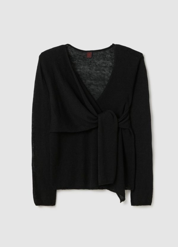 Maglia realizzata in filato di lino e cotone. Scollo a V con incrocio laterale e nodo. Maniche lunghe. Vestibilità regolare.