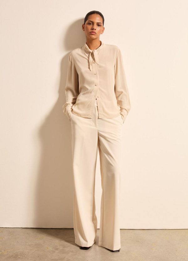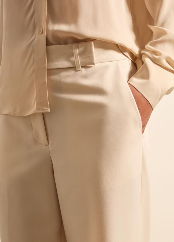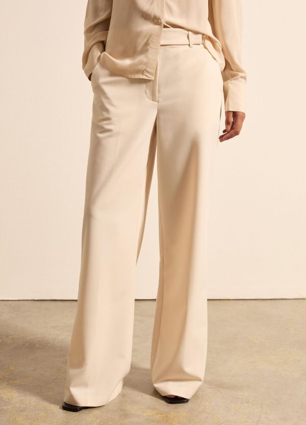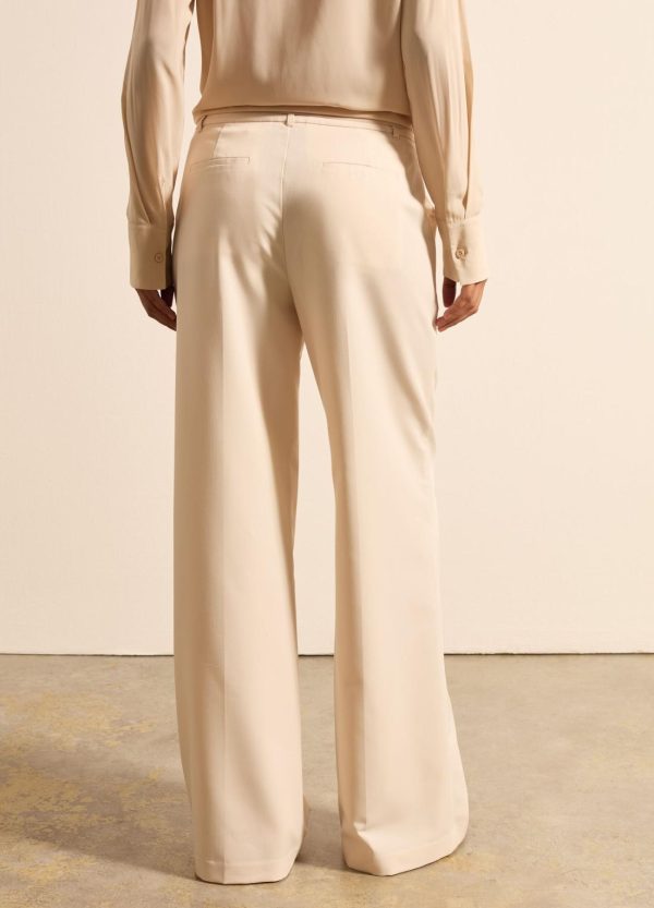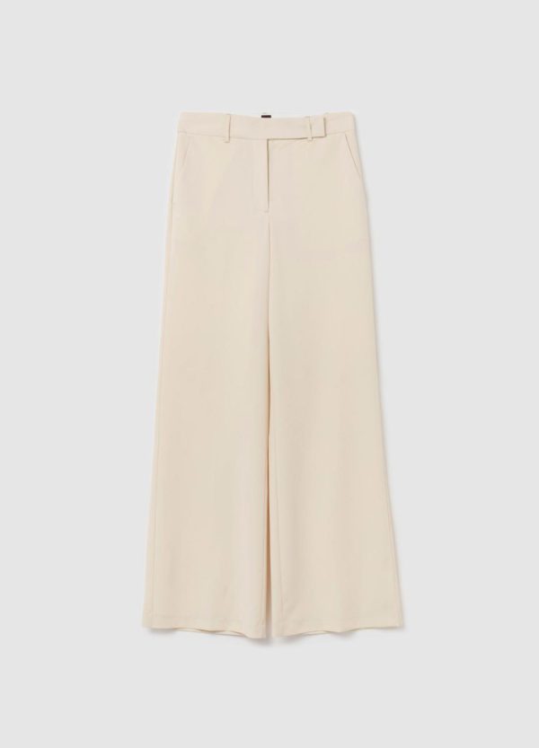 Pantalone a gamba larga realizzato in misto viscosa stretch. Vestibilità regolare. Due tasche oblique. Chiusura nascosta con gancio interno, bottone e zip. Componibile con blazer abbinato.