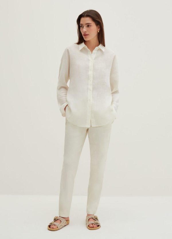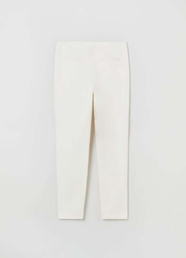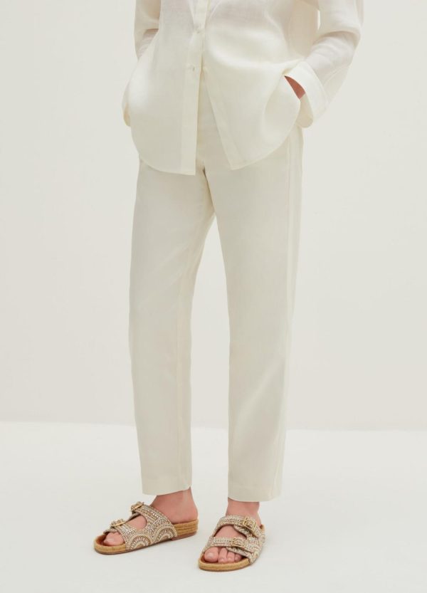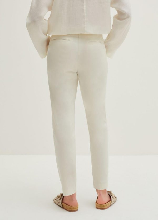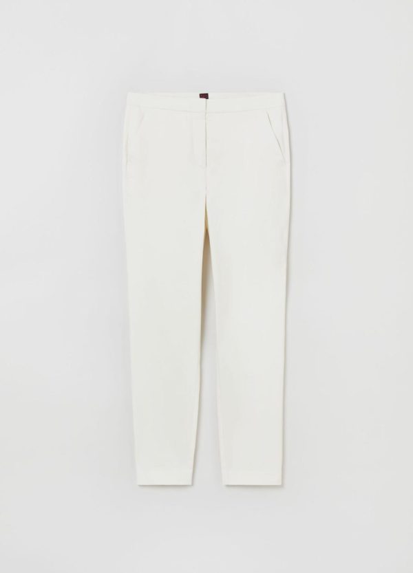 Pantalone a sigaretta in raso di misto cotone elasticizzato. Vita alta. Due tasche oblique e due tasche a filo sul retro.