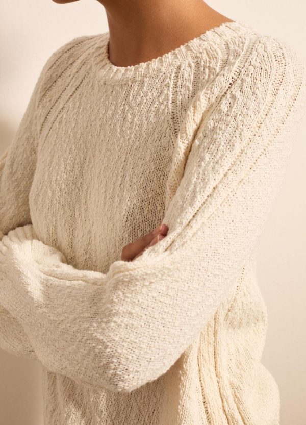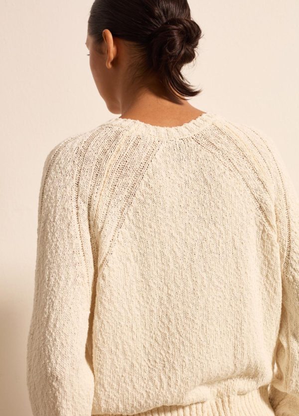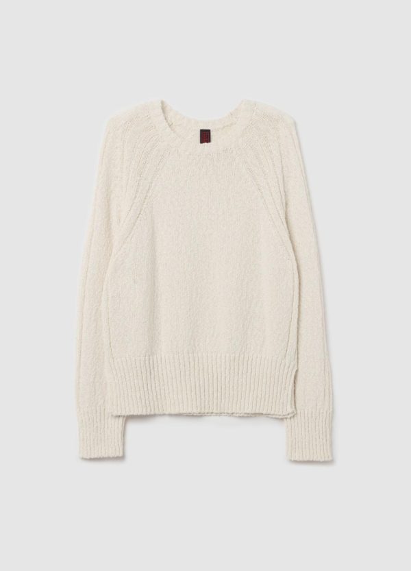 Pullover realizzato in filato di cotone e lino. Vestibilità regolare. Scollo rotondo. Maniche raglan. Profili rifiniti a coste.