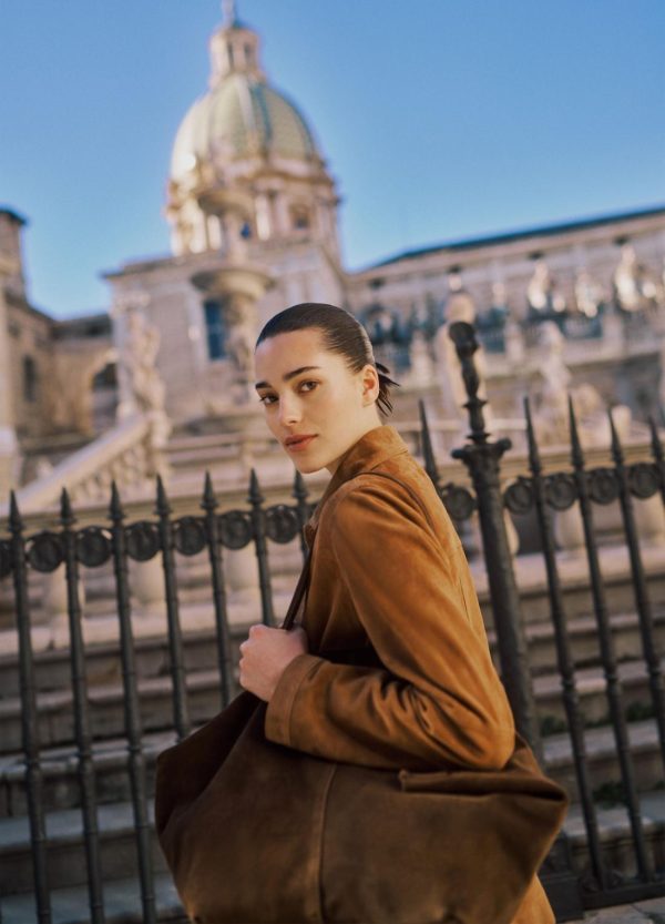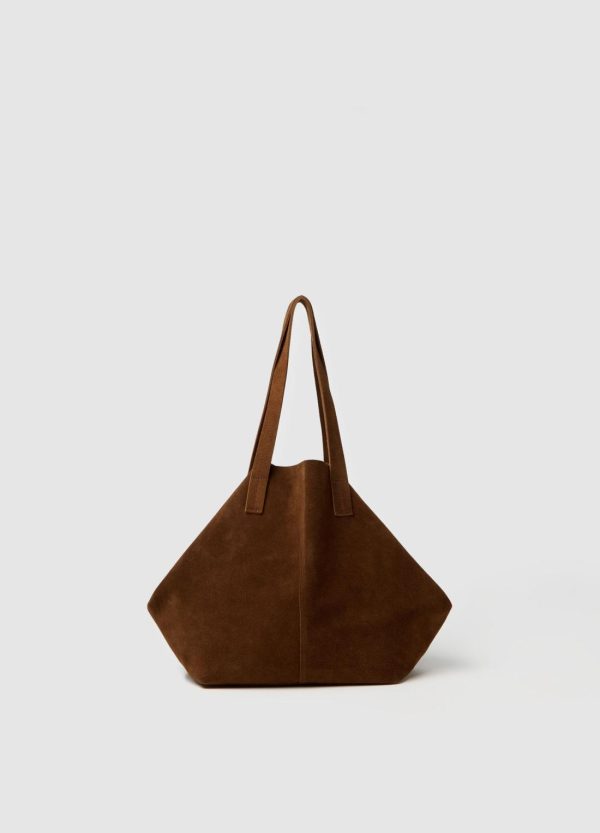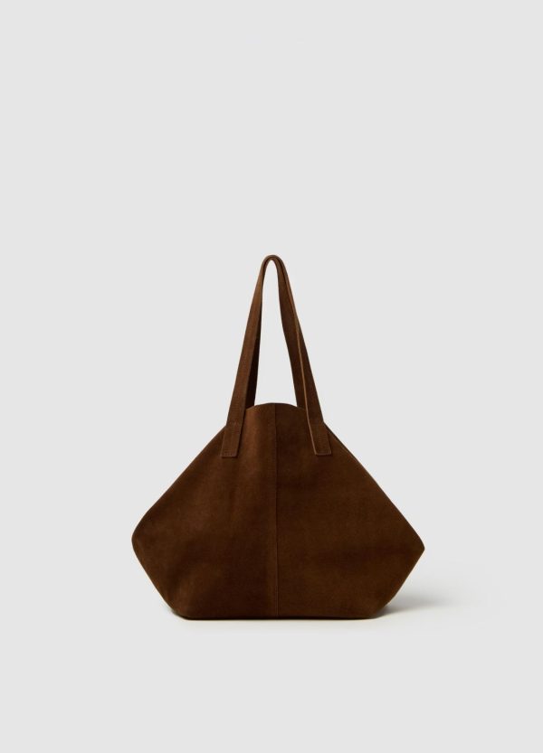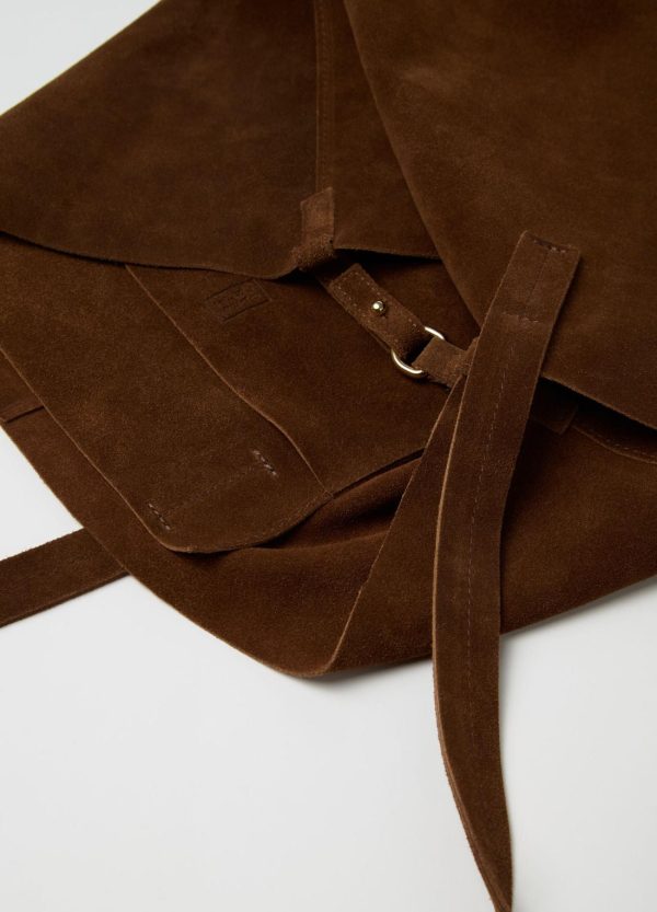 Borsa shopper realizzata in vera pelle scamosciata dotata di doppi manici. Chiusura interna con laccetto bottone a funghetto.