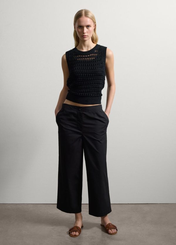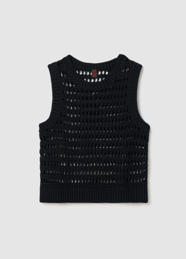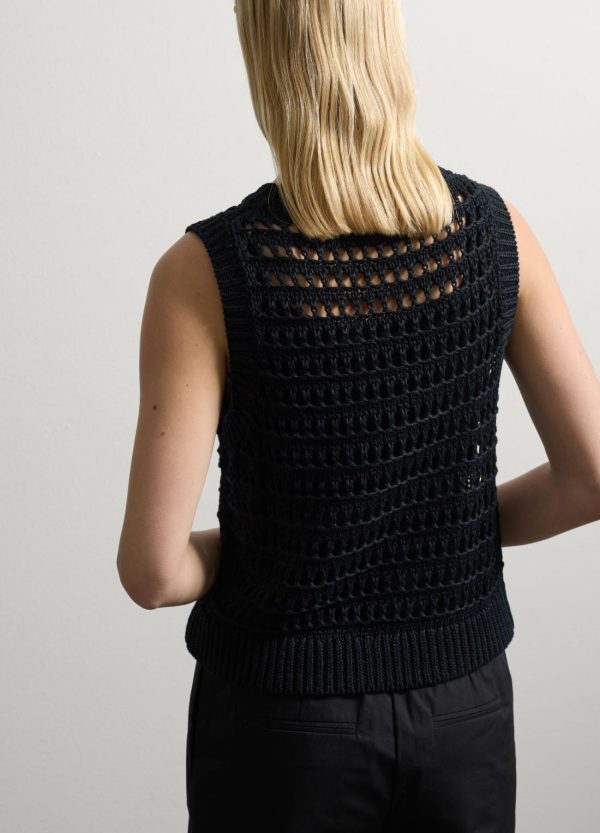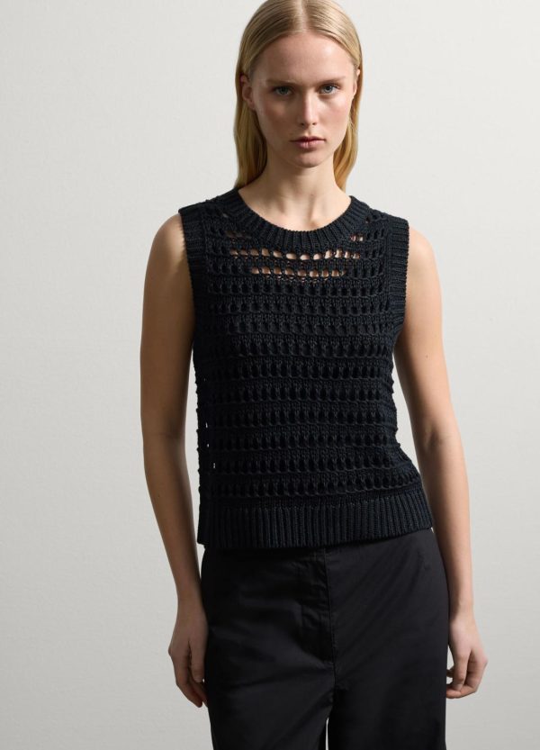 Tank top realizzato in maglia di misto lino con lavorazione traforata. Scollo rotondo. Profili rifiniti a coste. Vestibilità regolare.