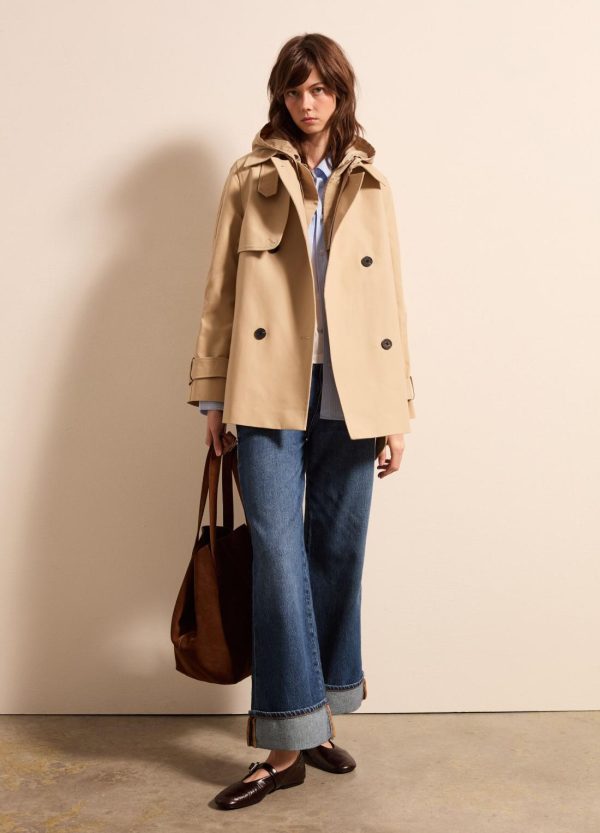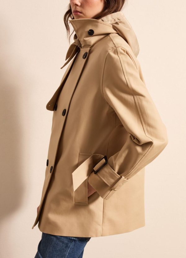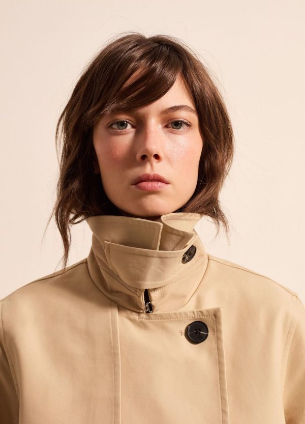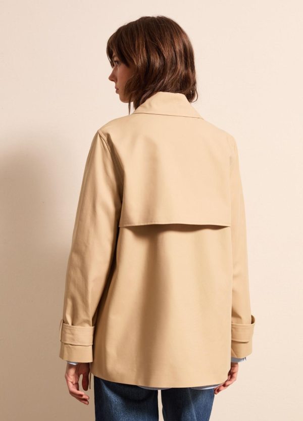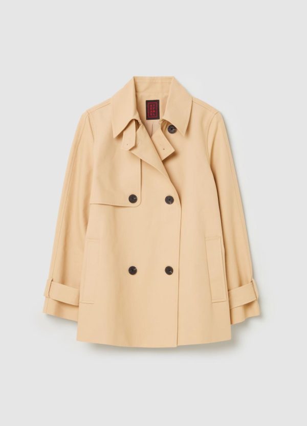 Trench corto realizzato in puro cotone. Colletto classico e fascetta con bottone sul lato. Carré sul retro. Due tasche verticali. Fondo manica regolabile con fibbia scorrevole. Chiusura doppiopetto con bottoni.