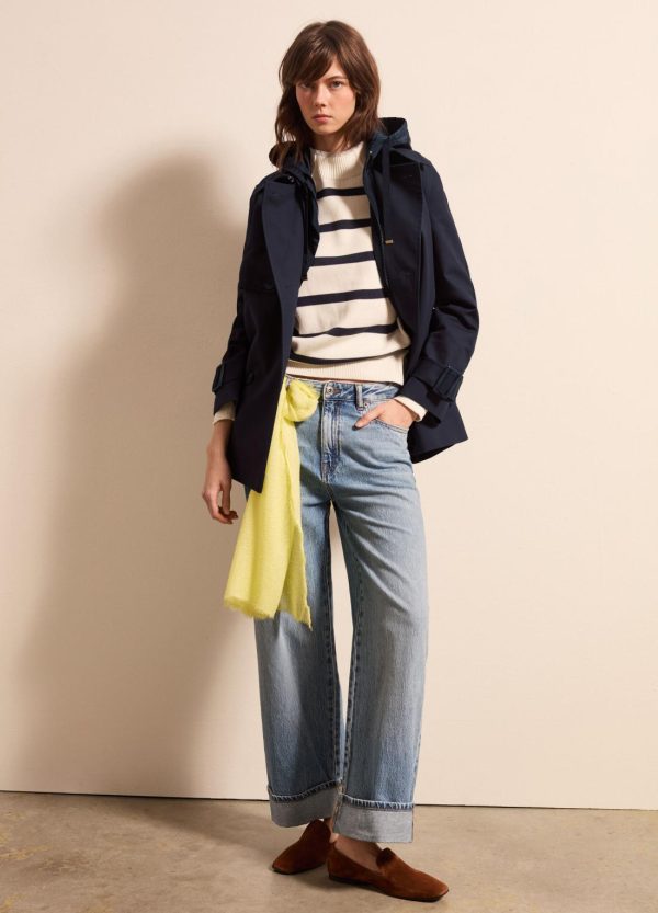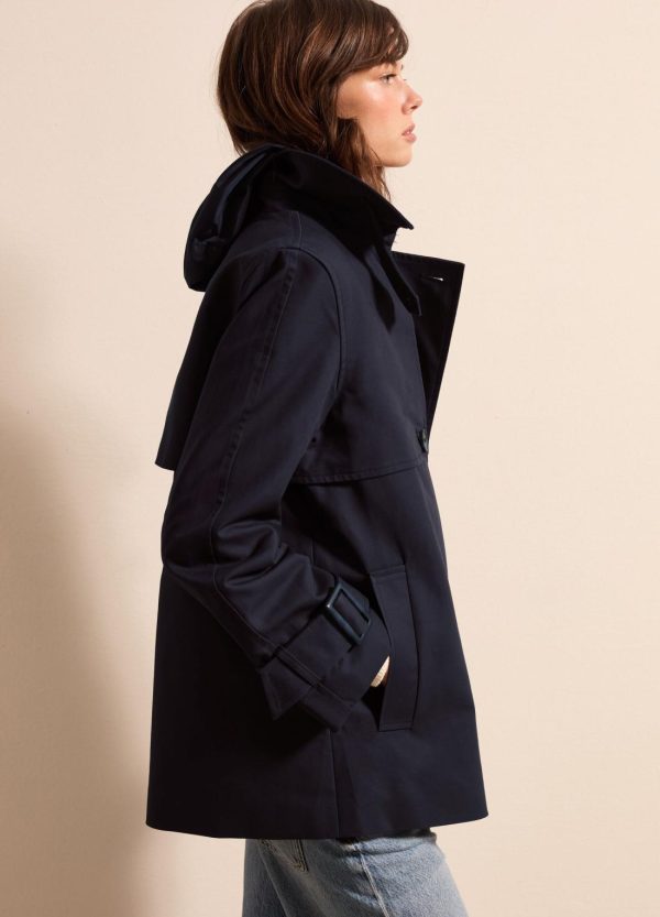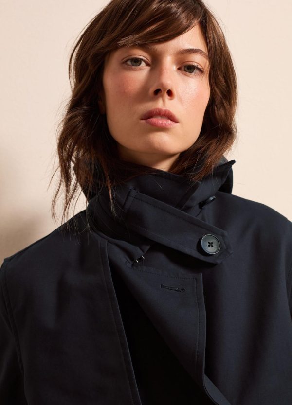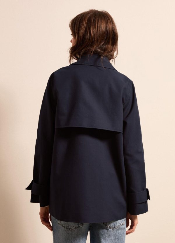 Trench corto realizzato in puro cotone. Colletto classico e fascetta con bottone sul lato. Carré sul retro. Due tasche verticali. Fondo manica regolabile con fibbia scorrevole. Chiusura doppiopetto con bottoni.