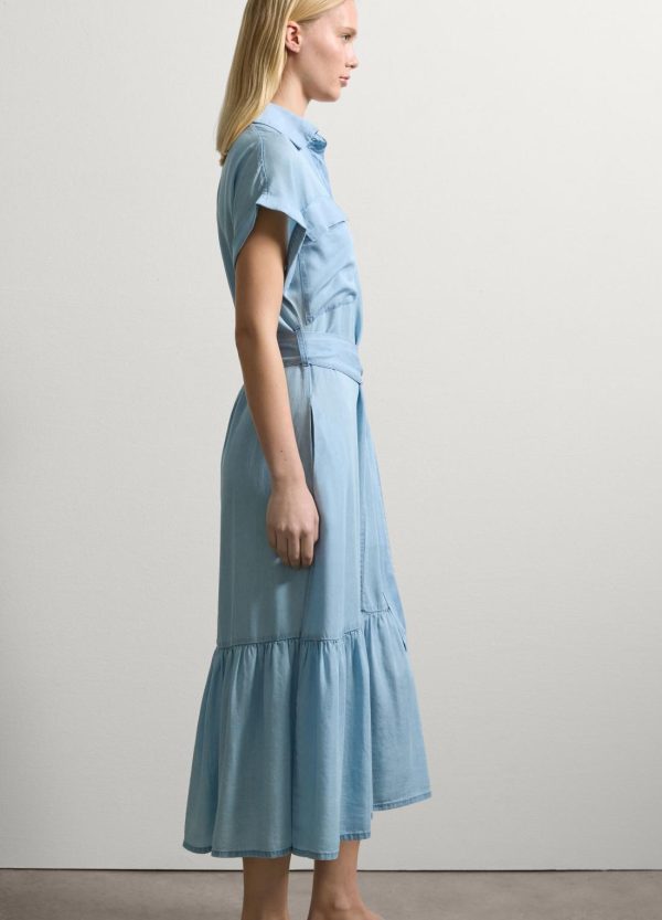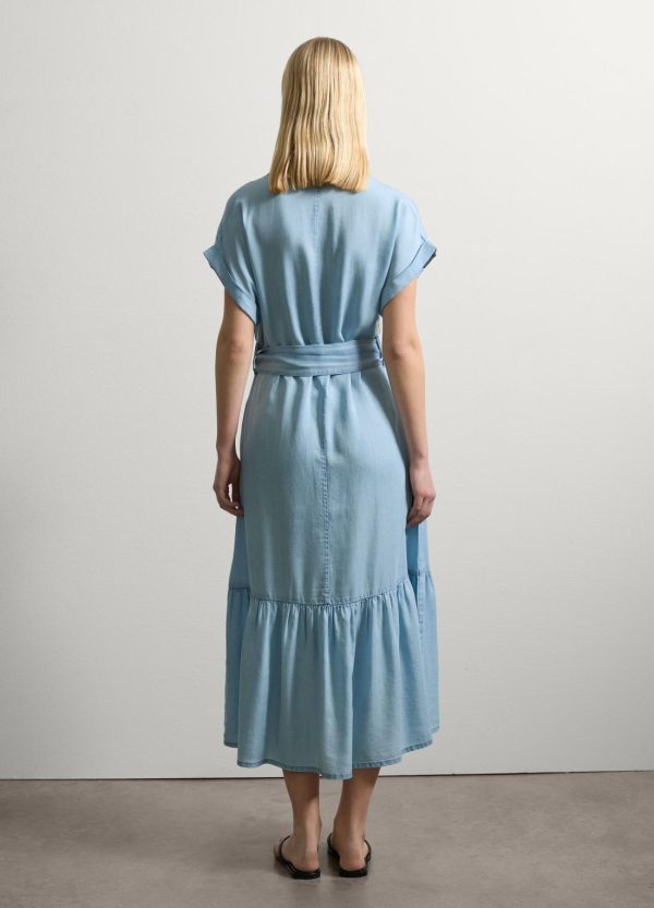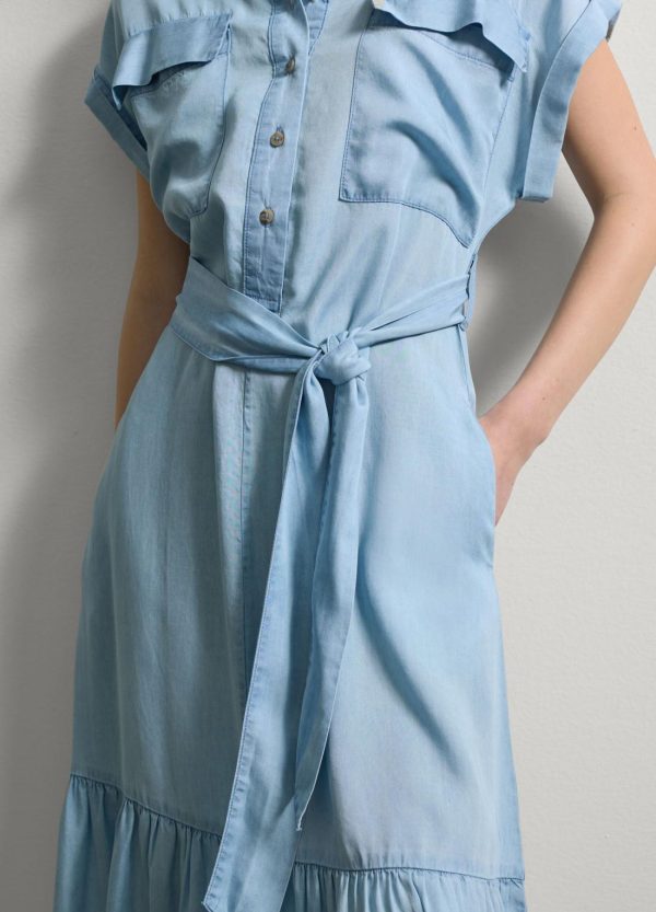 Vestito chemisier realizzato in Tencel di puro Lyocell effetto denim. Maniche corte a kimono con risvolti fissati al fondo. Due tasche con pattina sul petto. Cintura annodata sulla vita. Gonna con balza al fondo. Chiusura frontale con bottoni. Lunghezza midi.