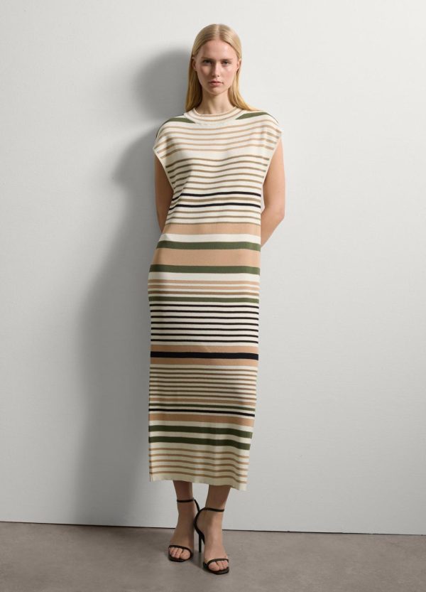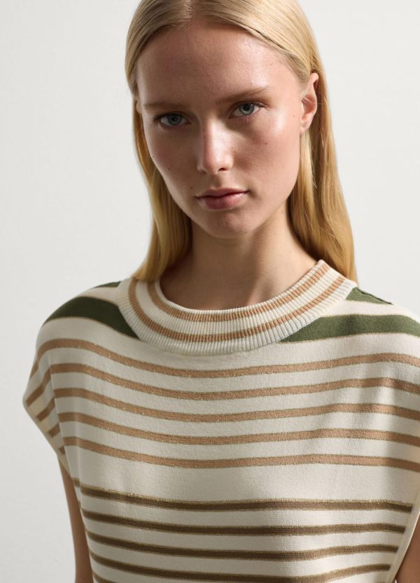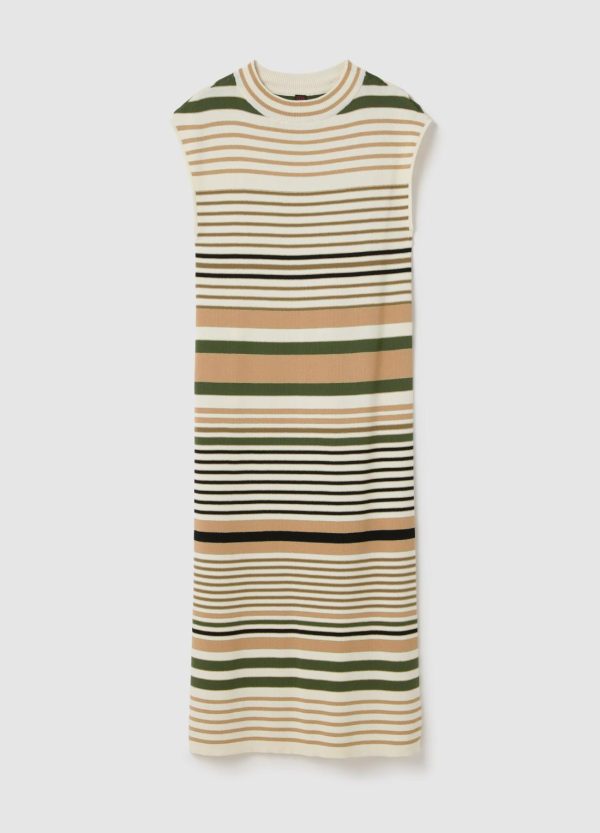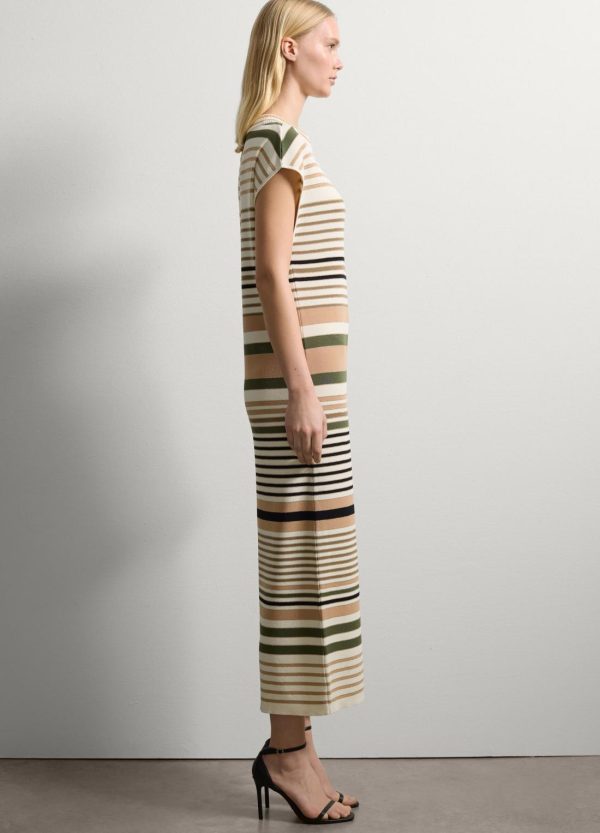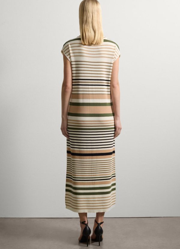 Vestito lungo realizzato in misto viscosa con fantasia a righe orizzontali e dettagli in lurex. Scollo rotondo. Maniche corte.